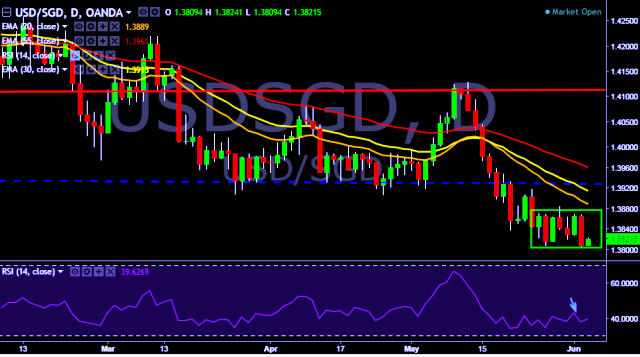We prefer to take short position in USD/SGD only below 1.3808, stop loss 1.3868 and target of 1.3704.