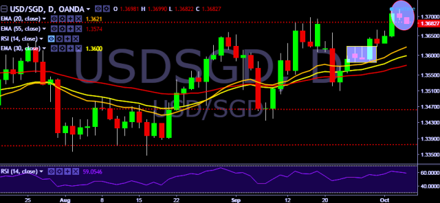 We prefer to go short on USD/SGD around 1.3690 with stop loss at 1.3720 and target of 1.3646/1.3587.