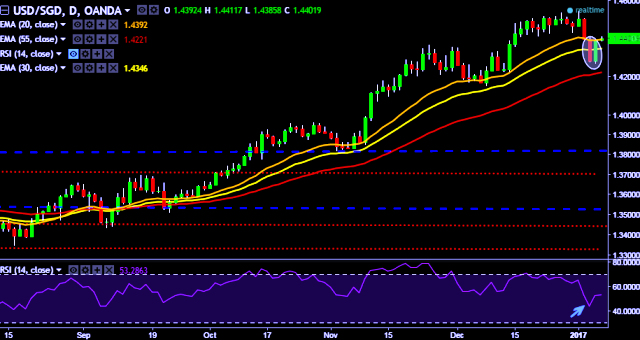 We prefer to take long position in USD/SGD around 1.4390, stop loss at 1.4269 and target of 1.4506.
