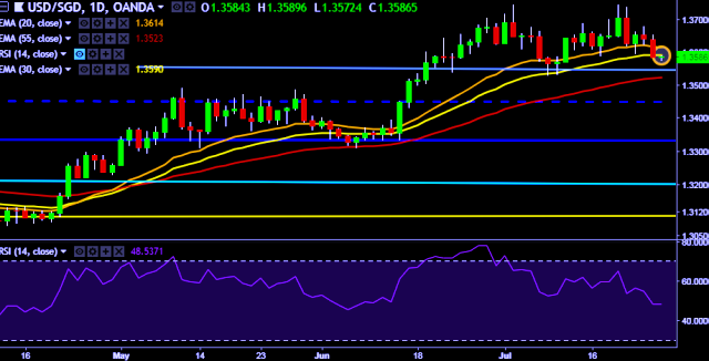 We prefer to take short position on USD/SGD only below 1.3570, stop loss 1.3652 and target of 1.3530/1.3496.