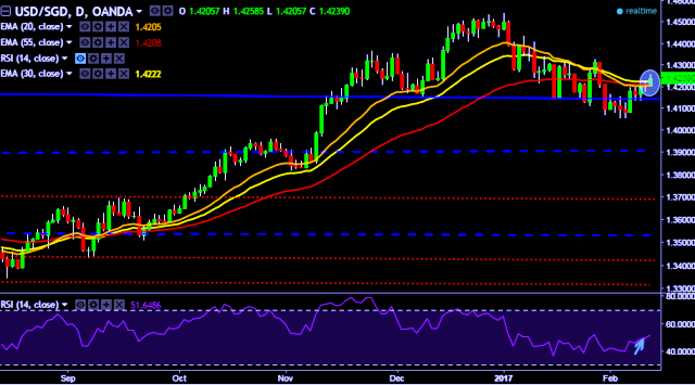 We prefer to take long position in USD/SGD around 1.4225, stop loss 1.4205 and target of 1.4297.