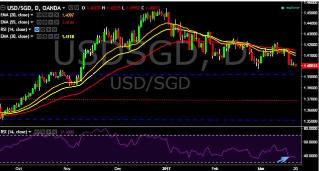We prefer to take short position in USD/SGD around 1.4010, stop loss 1.4090 and target of 1.3920/1.3851.