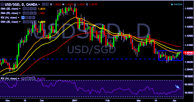 We prefer to take long position in USD/SGD only above 1.4022, stop loss 1.3993 and target of 1.4064/1.4160.