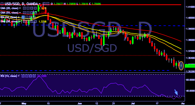 We prefer to take short position in USD/SGD around 1.3570, stop loss at 1.3615 and target of 1.3512.