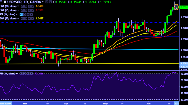 We prefer to take long position on USD/SGD only above 1.3600, stop loss 1.3565 and target of 1.3678.
