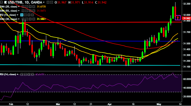 We prefer to take long position in USD/THB only above 31.96, stop loss at 31.80 and target of 32.22/32.46.