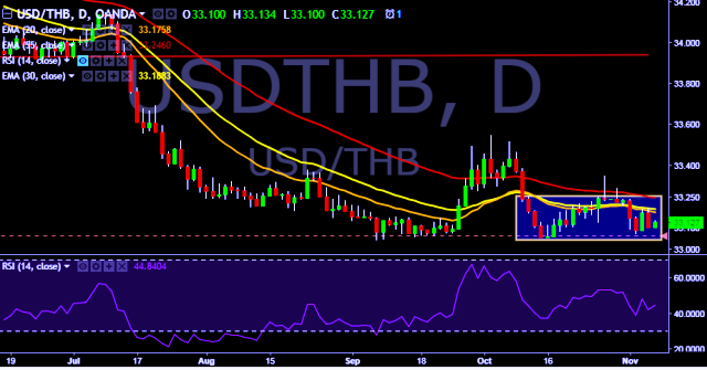 We prefer to take short position on USD/THB only below 33.03, stop loss at 33.22 and target of 32.77 mark.