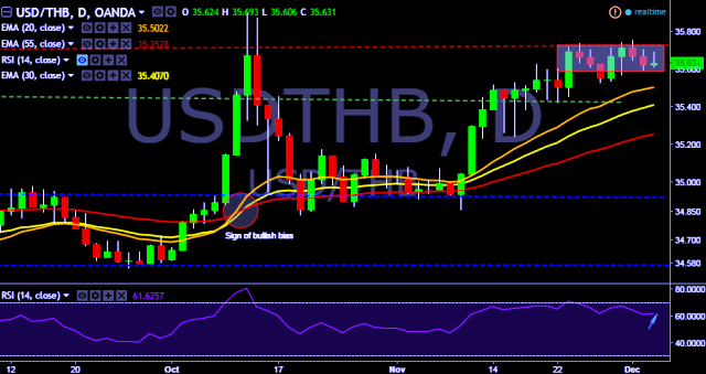 We prefer to take long position in USD/THB only above 35.70, stop loss at 35.58 and target of 35.90.