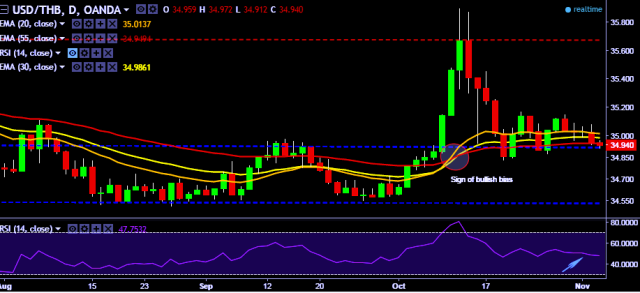 - USD/THB is currently trading around 34.96 marks.