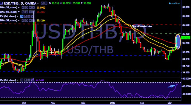 We prefer to take long position in USD/THB only above 35.32, stop loss at 35.10 and target of 35.47/35.62.