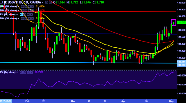 We prefer to take long position in USD/THB around 31.70, stop loss at 31.53 and target of 31.92.