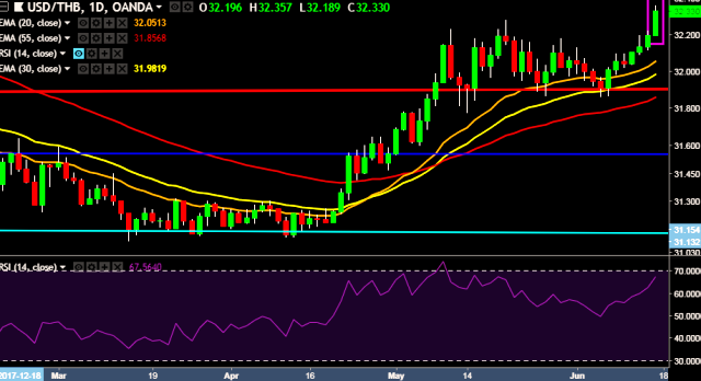 We prefer to take long position in USD/THB around 32.28, stop loss at 32.10 and target of 32.48.
