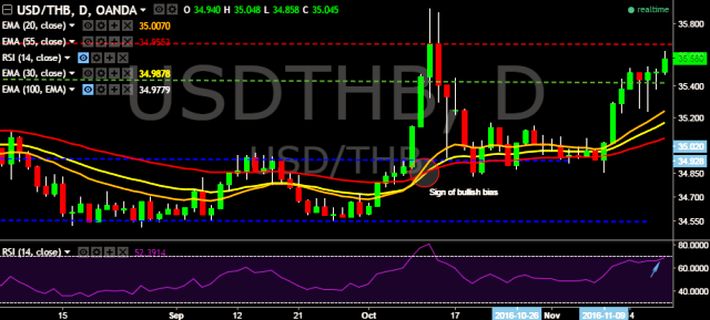 We prefer to take long position in USD/THB around 35.55, stop loss at 35.23 and target of 35.90/36.05.