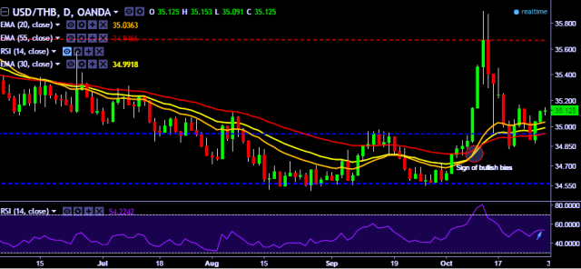 We prefer to take long position in USD/THB around 35.10, stop loss at 35.02 and target of 35.25/35.45.
