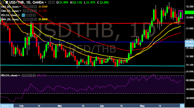 We prefer to take long position in USD/THB around 32.05, stop loss at 31.90 and target of 32.48.