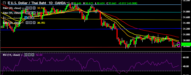 We prefer to go long on USD/THB only above 30.70, stop loss at 30.50 and target of 30.97 mark.