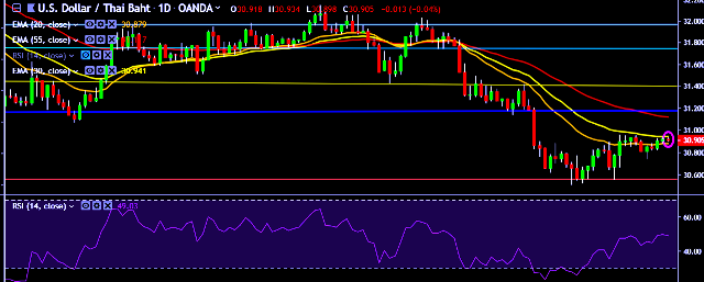 We prefer to take long position on USD/THB only above 30.95, stop loss at 30.80 and target of 31.20/31.50.