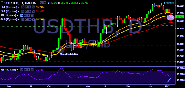 We prefer to take long position in USD/THB around 35.70, stop loss at 35.54 and target of 35.84/35.93.