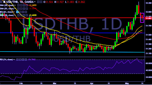We prefer to take long position in USD/THB around 31.82, stop loss at 31.68 and target of 32.13.