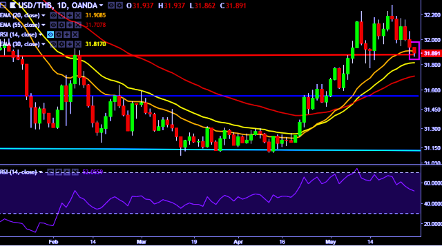 We prefer to take short position in USD/THB around 31.90, stop loss at 32.06 and target of 31.51.