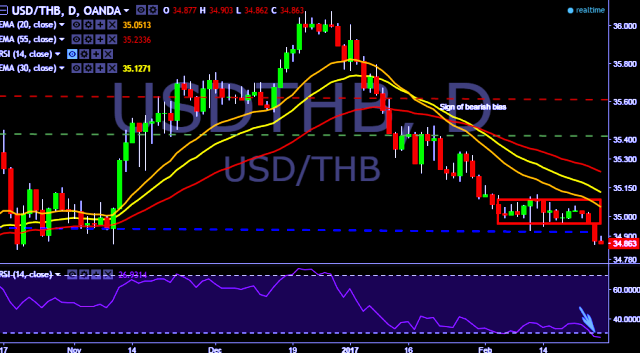 We prefer to take short position in USD/THB around 34.90, stop loss at 34.97 and target of 34.64.
