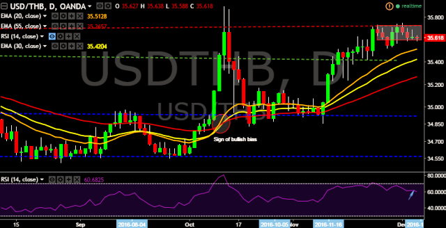 We prefer to take long position in USD/THB only above 35.70, stop loss at 35.58 and target of 35.90.