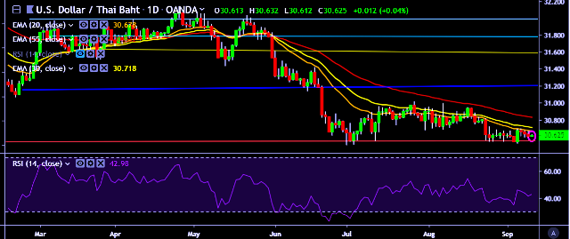 We prefer to go long on USD/THB only below 30.55, stop loss at 30.70 and target of 30.28.