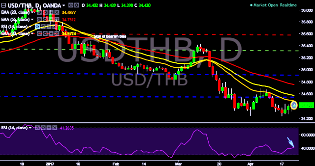 We prefer to take long position in USD/THB only above 34.44, stop loss at 34.27 and target of 34.68.