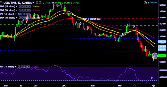 We prefer to take short position in USD/THB only below 34.35, stop loss at 34.48 and target of 34.20/34.11.
