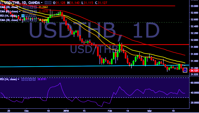 We prefer to take short position in USD/THB around 31.13, stop loss at 31.22 and target of 31.01.