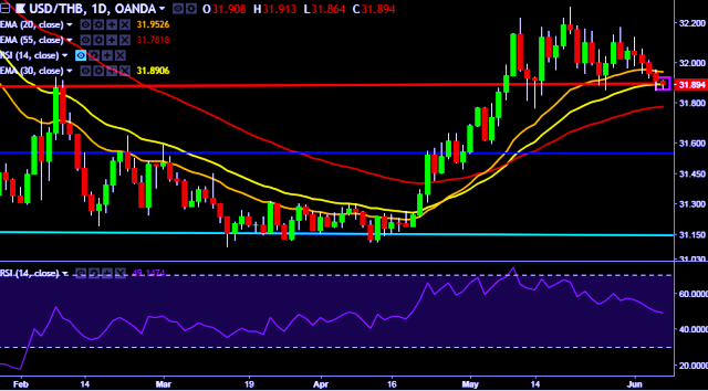 We prefer to take short position in USD/THB only below 31.85, stop loss at 32.02 and target of 31.68.