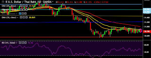 We prefer to take long position on USD/THB only above 30.97, stop loss at 30.70 and target of 31.20/31.50.