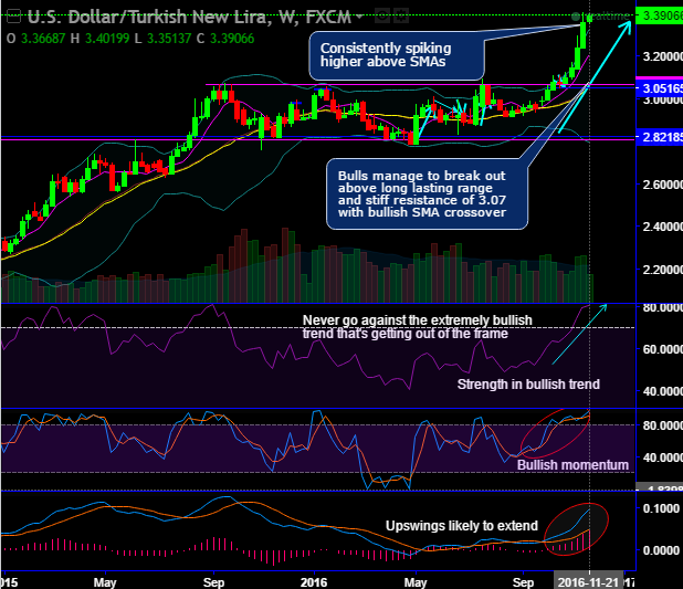 The Turkish lira weakened sharply in the recent times, with USDTRY surpassing 3.05 range and then to hit fresh highs of 3.4083 levels.