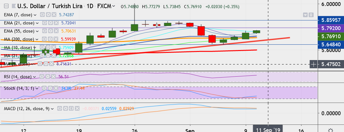- USD/TRY is currently trading 0.3 percent up at 5.7645, having hit a high of 5.7727 earlier, its highest since September 3.
