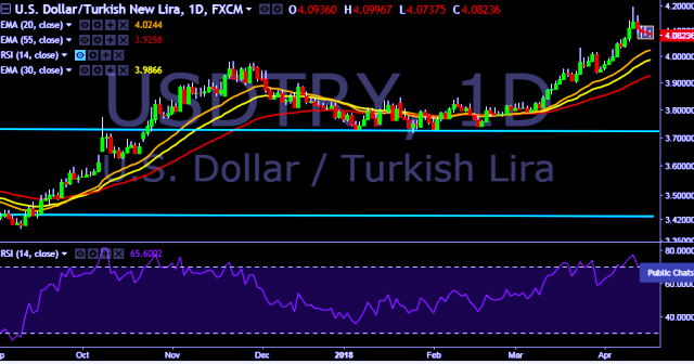 We prefer to go long on USD/TRY only above 4.12, stop loss at 4.0700 and target of 4.1723.