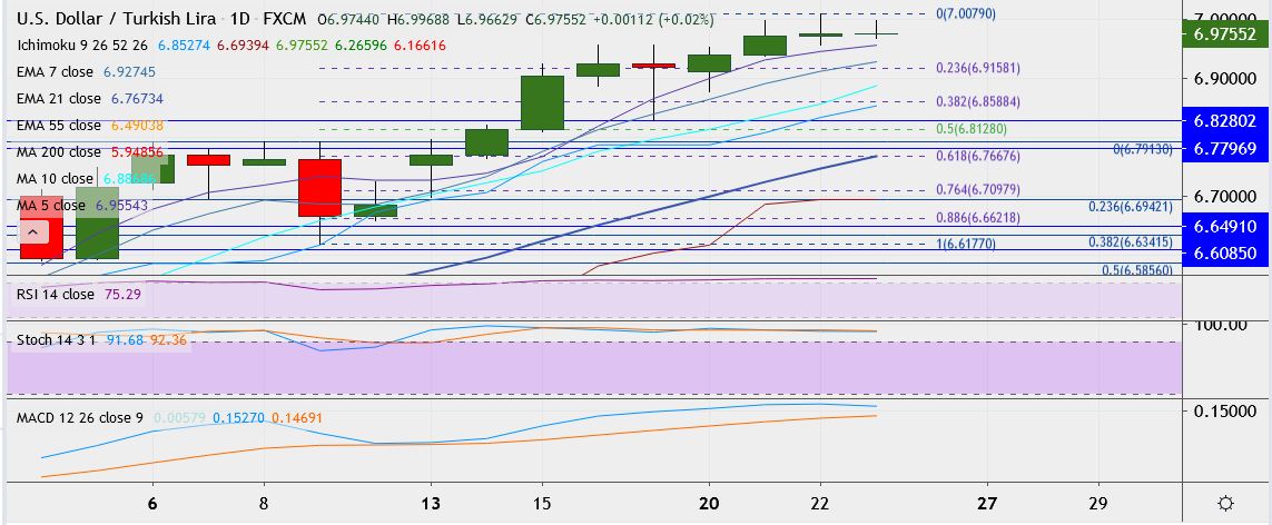 - USD/TRY is trading flat at 6.9757, having hit a high of 7.0079 on Wednesday, its highest since August 2018.