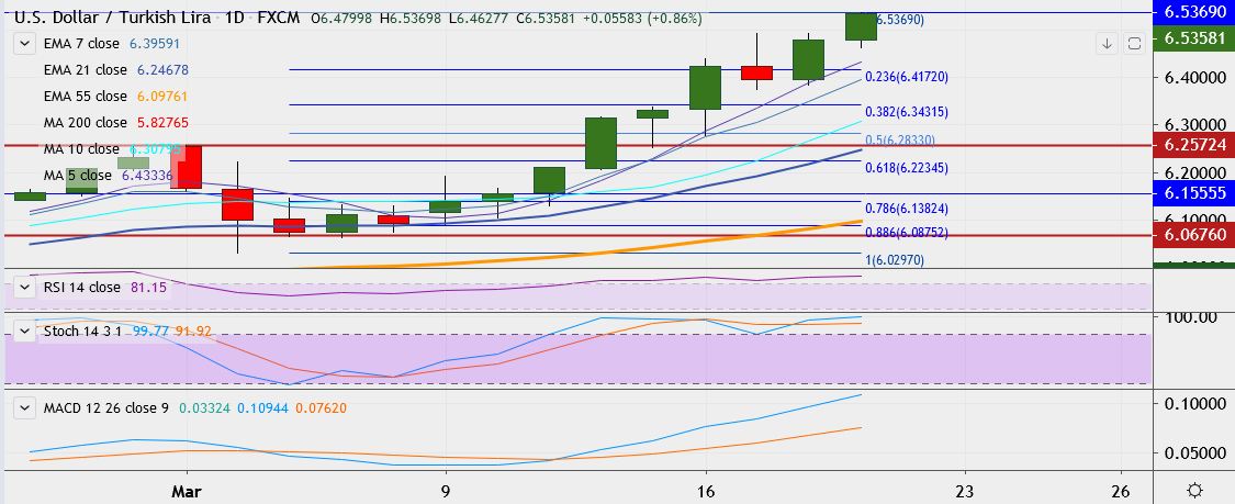 - USD/TRY is trading 0.9 percent up at 6.5361, having hit a high of 6.5369 earlier, its highest since September 2018.