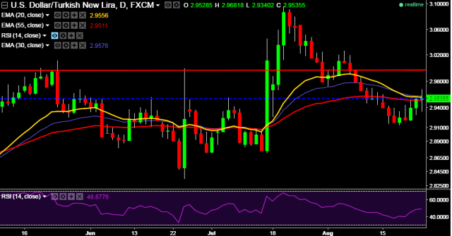 We prefer to take long position in USD/TRY around 2.95, stop loss 2.9290 and target 2.9977.
