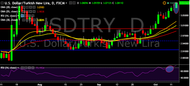 We prefer to go long on USD/TRY around 3.0970, stop loss at 3.0712 and target of 3.1099.