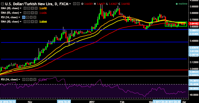 We prefer to go long on USD/TRY around 3.6390, stop loss 3.62 and target of 3.6925.