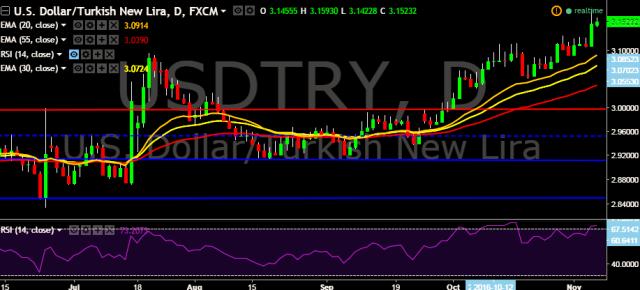 We prefer to go long on USD/TRY around 3.1450, stop loss at 3.1088 and target of 3.1736.