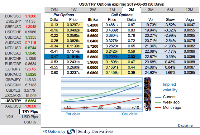 Trade tips: 3m USDTRY debit call spreads are advocated with a view to arresting upside risks. Initiate 3m 5.30/6.54 call spreads at net debit. Thereby, one achieves hedging objective as the deep in the money call option with a very strong delta will move in tandem with the underlying spikes.