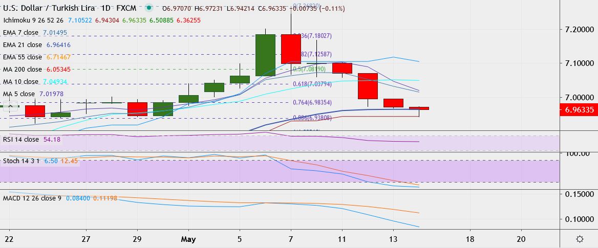 - USD/TRY is trading 0.1 percent down at 6.9627, having hit a low of 6.9421 earlier, its lowest since April 24.