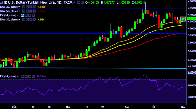 We prefer to go long on USD/TRY around 4.0690, stop loss at 4.0297 and target of 4.1102.