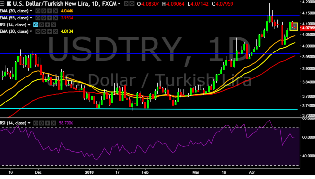 We prefer to go long on USD/TRY only above 4.0910, stop loss at 4.0700 and target of 4.1520.