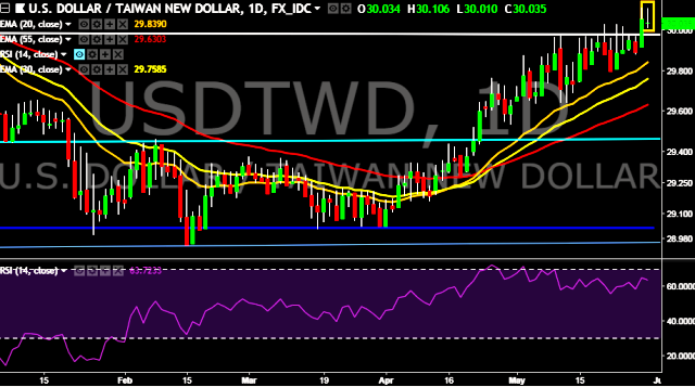 We prefer to take long position on USD/TWD around 30.02, stop loss 29.90 and target of 30.38.