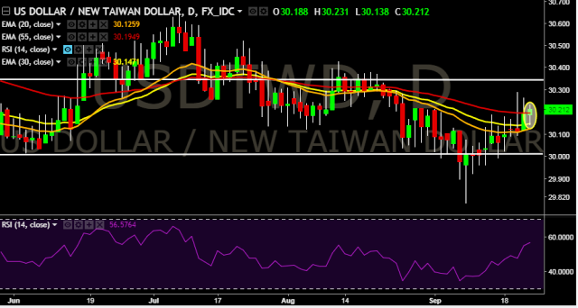 We prefer to take long position in USD/TWD around 30.18, stop loss at 30.09 and target of 30.50 mark.