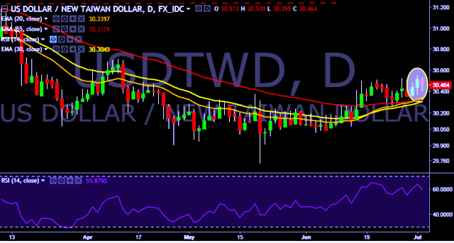 We prefer to take long position in USD/TWD around 30.45, stop loss at 30.24 and target of 30.90.