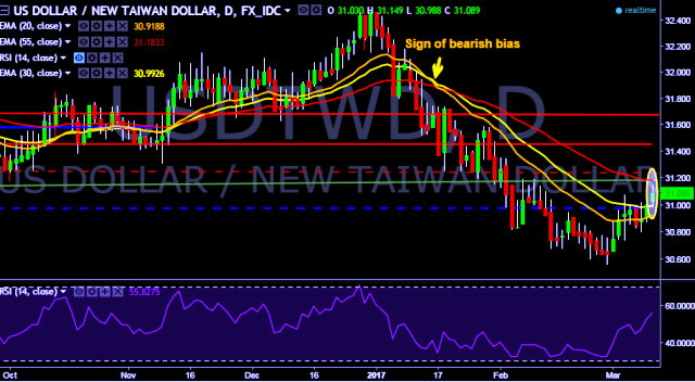 We prefer to go long on USD/TWD around 31.07 with stop loss at 31.00 and target of 31.26.