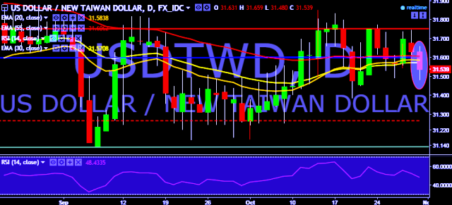 We prefer to go short on USD/TWD around 31.58, stop loss 31.74 and target of 31.38.